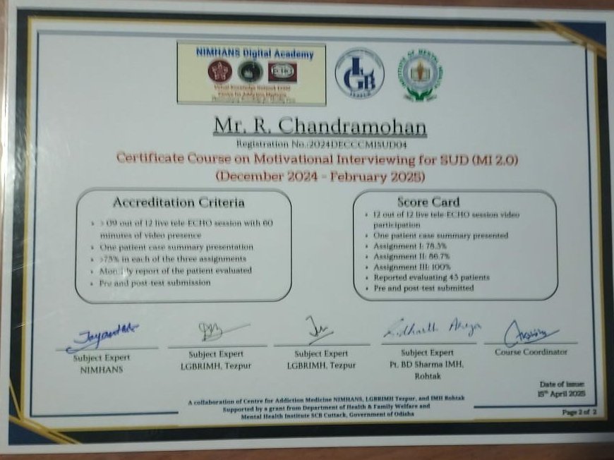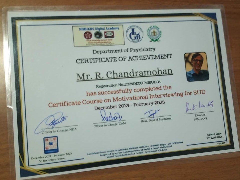 - Accredited on Addiction Management by NIMHANS ( https://nimhans.ac.in)